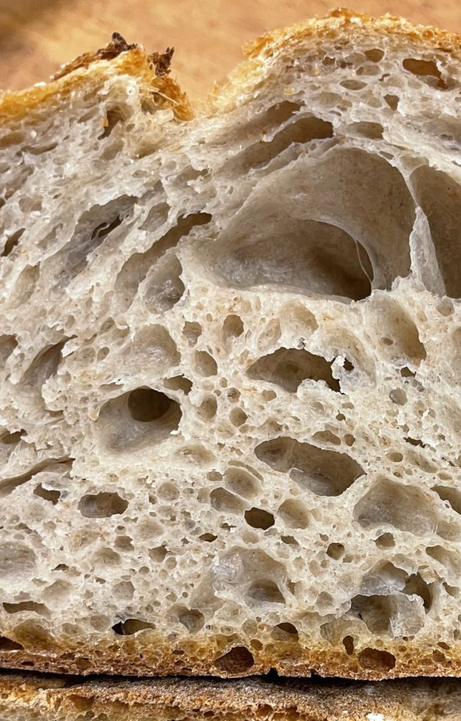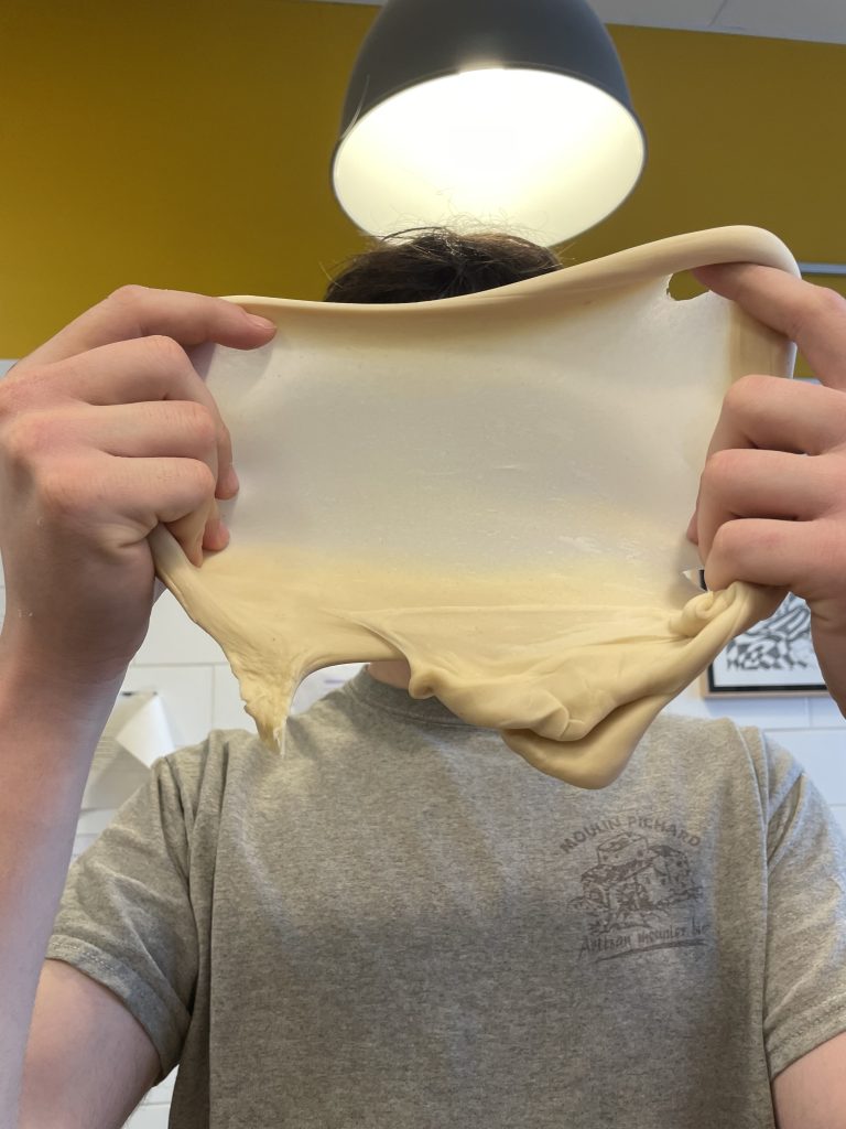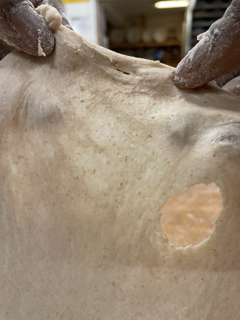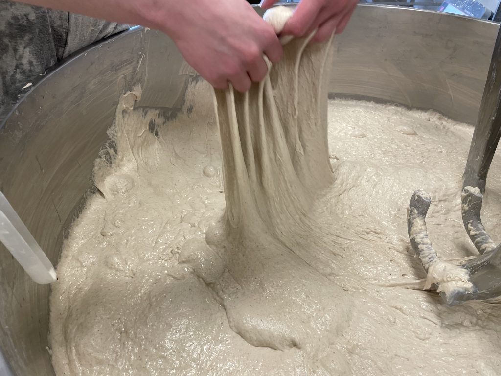 Une fois ce réseau bien constitué, on ajoute notre levain. En emprisonnant dans son filet les gaz produits par le levain, le gluten va permettre à nos pâtes de gonfler comme de vrais petits ballons ! Lors du passage des pains au four, le gaz capturé dans la pâte va se dilater, la mie et la croûte vont se former, et nous laisser avec de jolis pains à vous proposer.