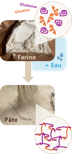 Lors du pétrissage, on commence d’abord par mélanger la farine et l’eau pour former une pâte homogène. Au contact de l’eau, les gliadines et les gluténines repliées sur elles-mêmes dans la farine se déroulent alors. Ainsi dépliées, ces protéines vont s’accrocher entre elles et former une sorte de filet. C’est ce que l’on appelle le “réseau de gluten”.