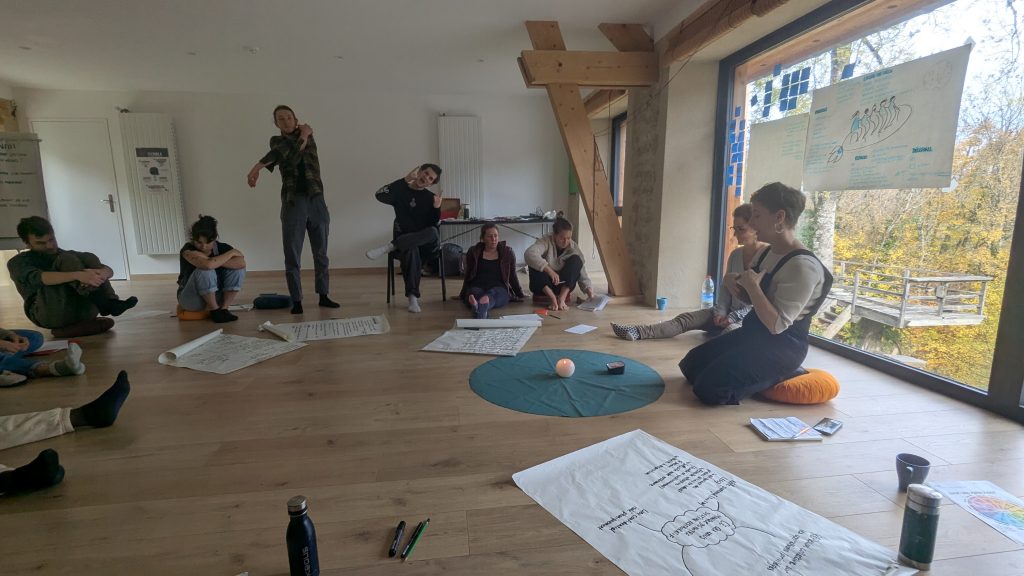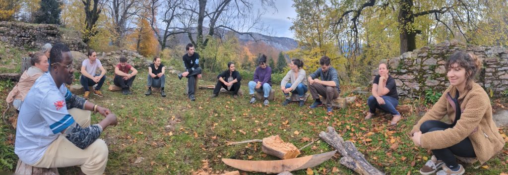 En fin d’après-midi, nous sommes montés dans la forêt en petits groupes au-dessus du gîte. Nous avons joué comme des enfants dans une clairière lumineuse. Puis nous avons trouvé des buches que nous avons mises en cercle pour nous poser une dernière fois avant de redescendre dans la vallée. En cet instant, personne n’avait envie de partir (peut-être les jeunes parents ?). Nous étions plein·es d’énergie et vidé·es à la fois pour certain·es. Alors avant que l’humidité ne nous rattrape, nous avons pu faire le point sur ces deux jours de gouvernance.