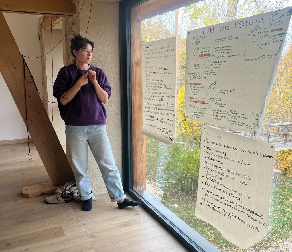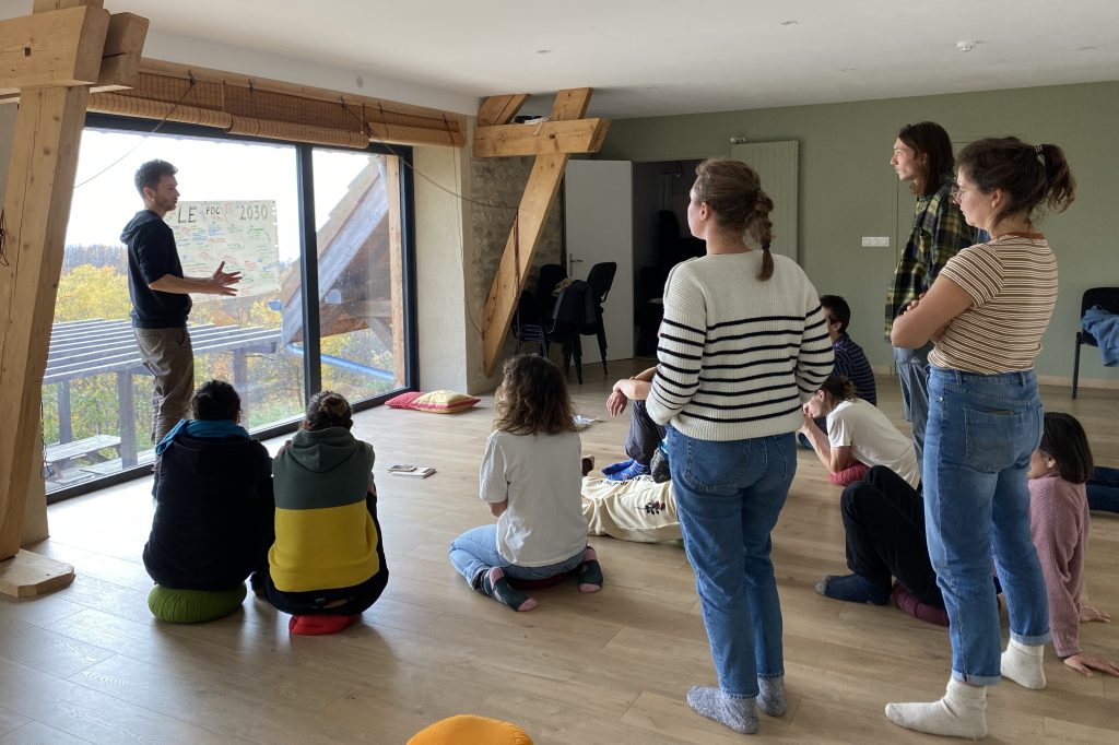 En fin d’après-midi, nous sommes montés dans la forêt en petits groupes au-dessus du gîte. Nous avons joué comme des enfants dans une clairière lumineuse. Puis nous avons trouvé des buches que nous avons mises en cercle pour nous poser une dernière fois avant de redescendre dans la vallée. En cet instant, personne n’avait envie de partir (peut-être les jeunes parents ?). Nous étions plein·es d’énergie et vidé·es à la fois pour certain·es. Alors avant que l’humidité ne nous rattrape, nous avons pu faire le point sur ces deux jours de gouvernance.